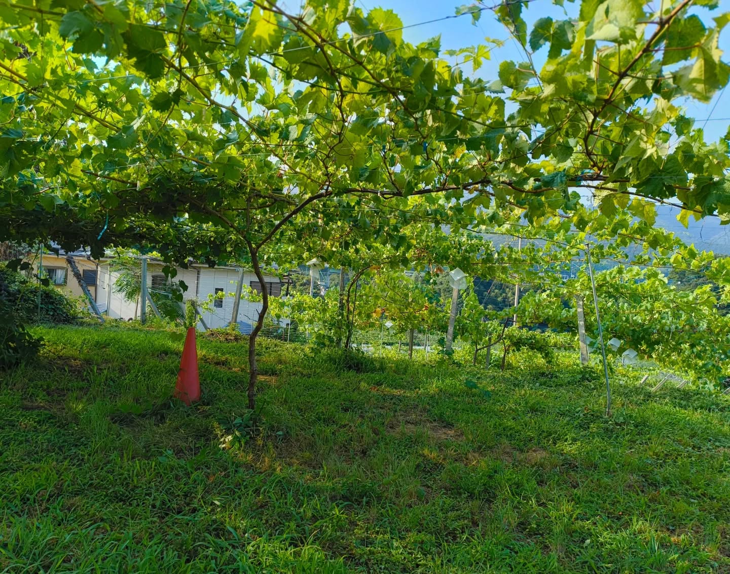写真は、これからが楽しみな植えて3年目のヌーベルローズとマスカット・ノワールの畑です。